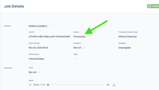 - The status will change to “Processing” while the file is being enhanced. After it completes, it will display that it is “Ready for Editing” again, with the Transcript Unlock Type now set to “ASOne Enhanced”.