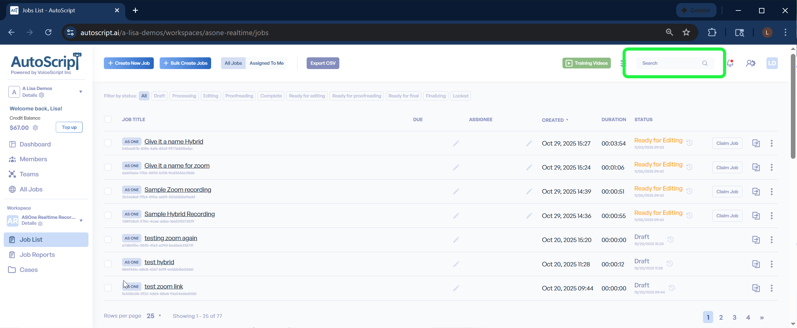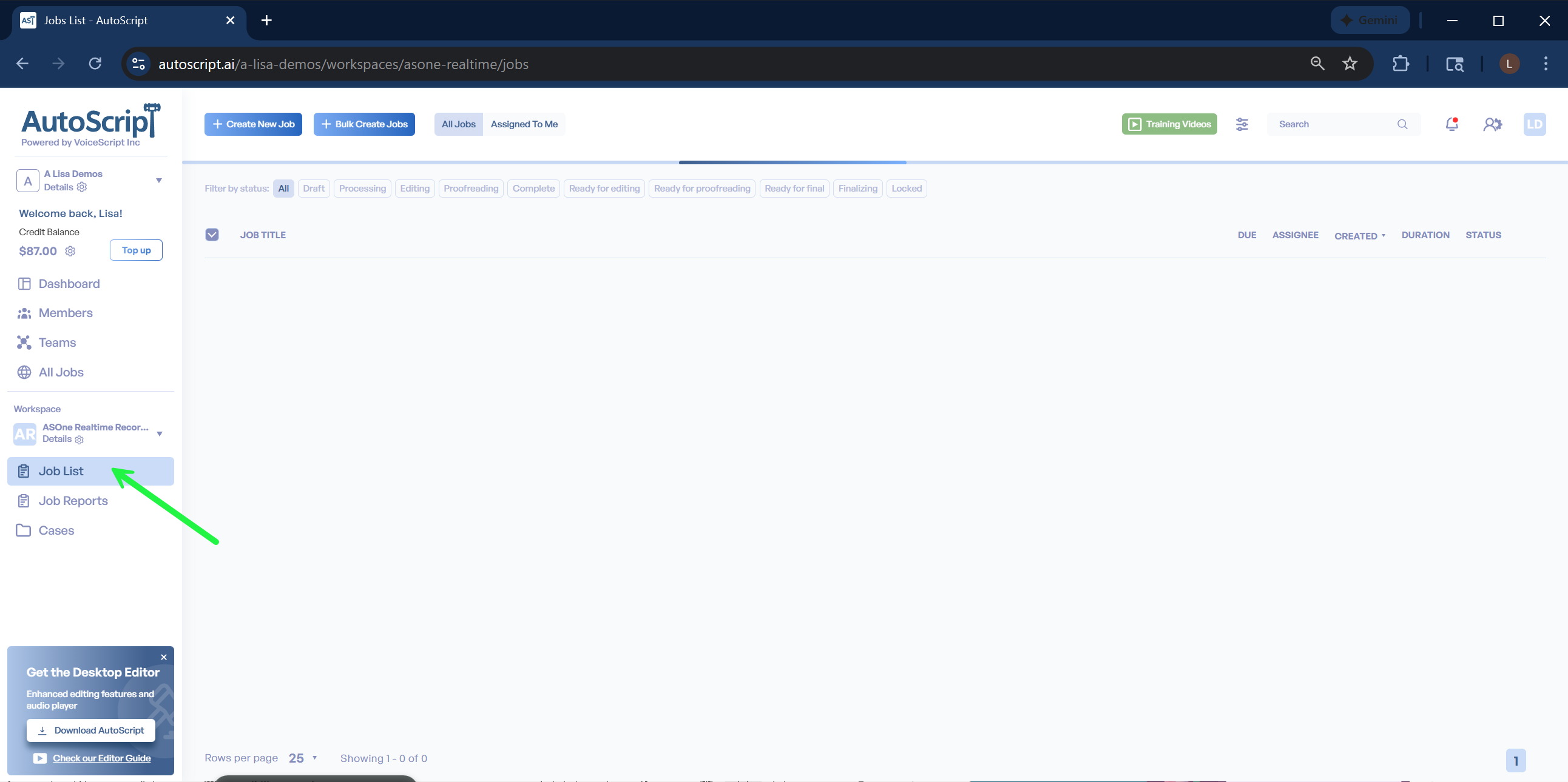- You will see that your job transcript type is set to "Session Text". You can access all of the job files. If you want to use this version of the transcript to edit in AutoScript Desktop, click on the "Start Editing in AutoScript" button to complete editing your transcript to a final version.