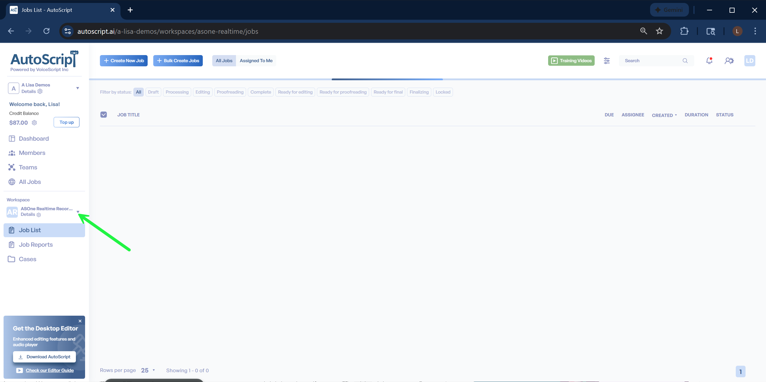- Select the “ASOne Realtime Recordings” Workspace using the dropdown for workspace selection. (This may be the workspace already displayed.)