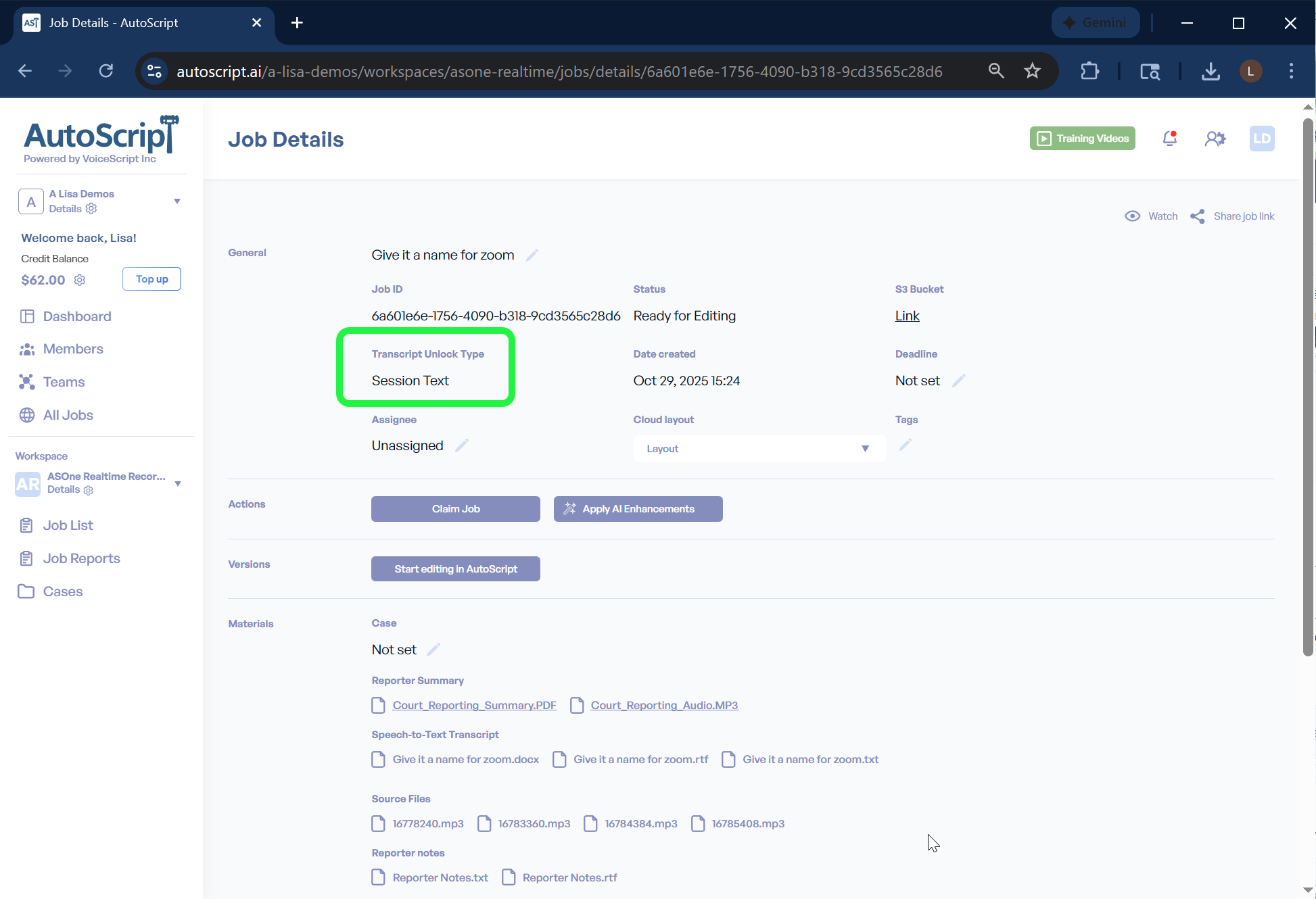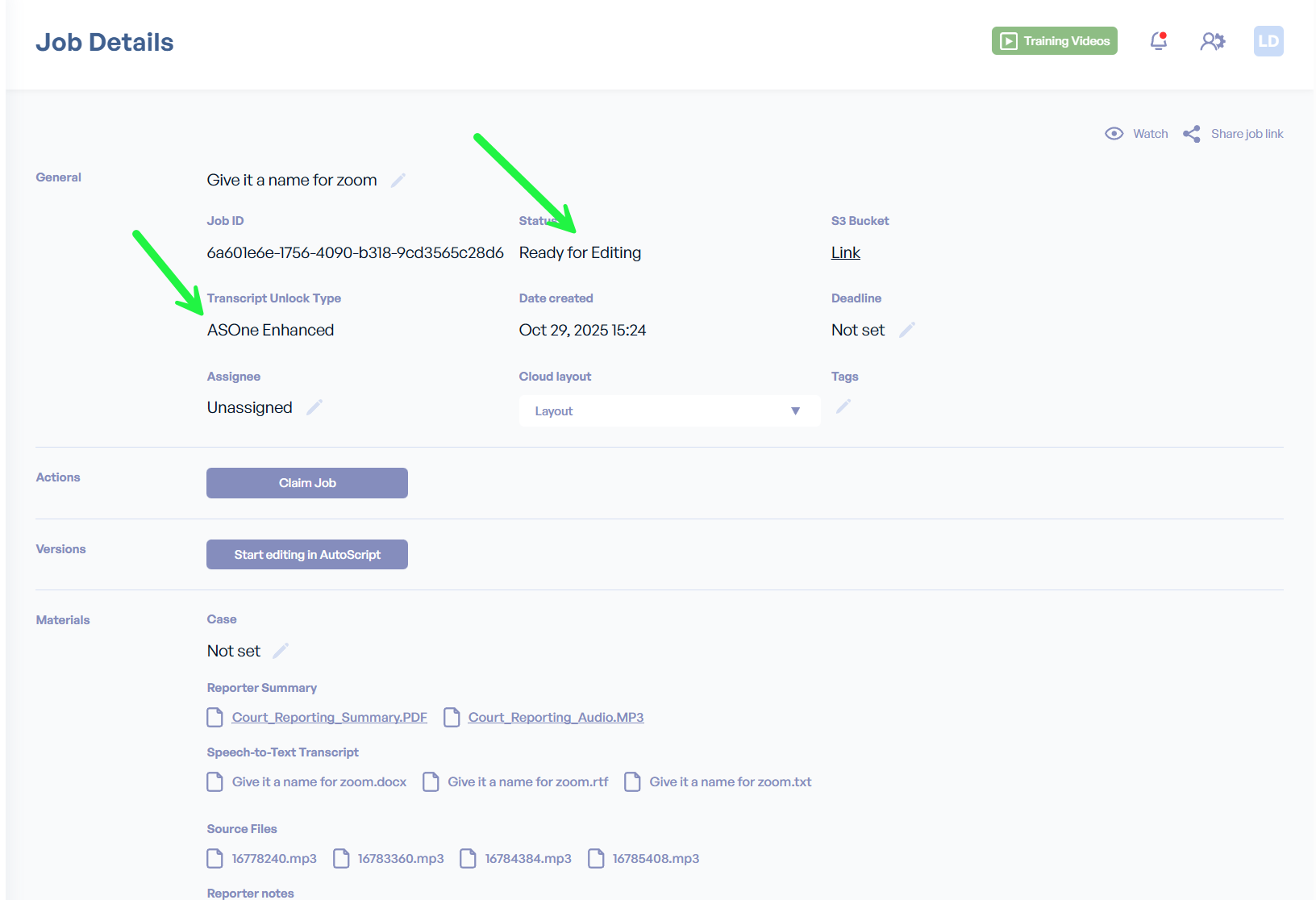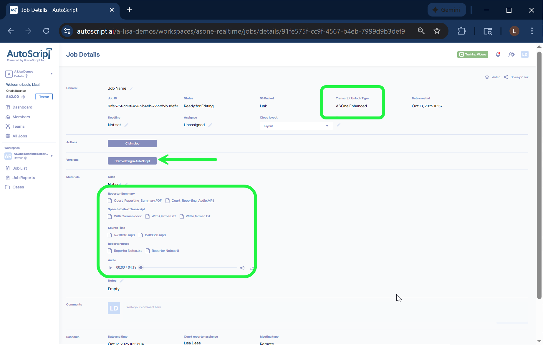 You will see that your job transcript type is set to "ASOne Enhanced". You can access all of the job files. Click on the "Start Editing in AutoScript" button to complete editing your transcript to a final version.