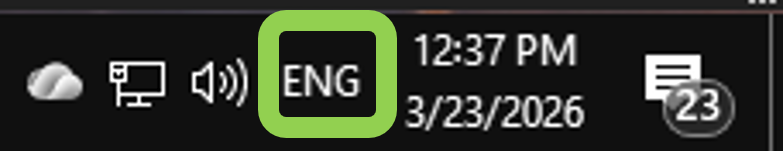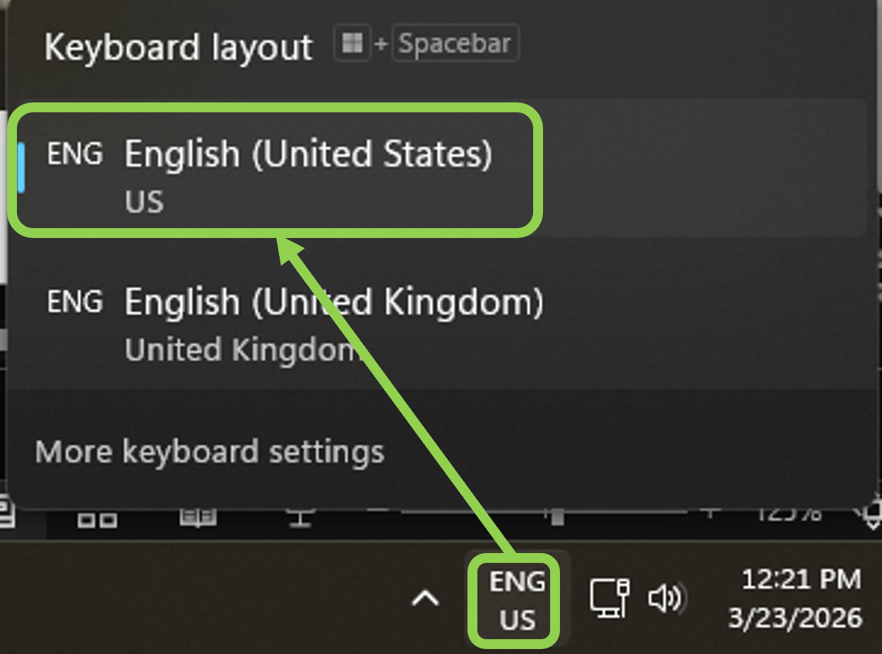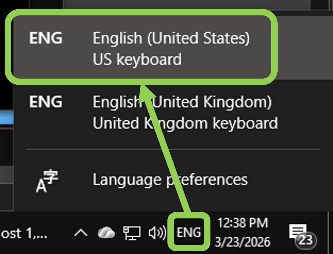 If you click on the control, you can select the language you want to use for typing. You need to select "English (United States)" when working in ASD.
