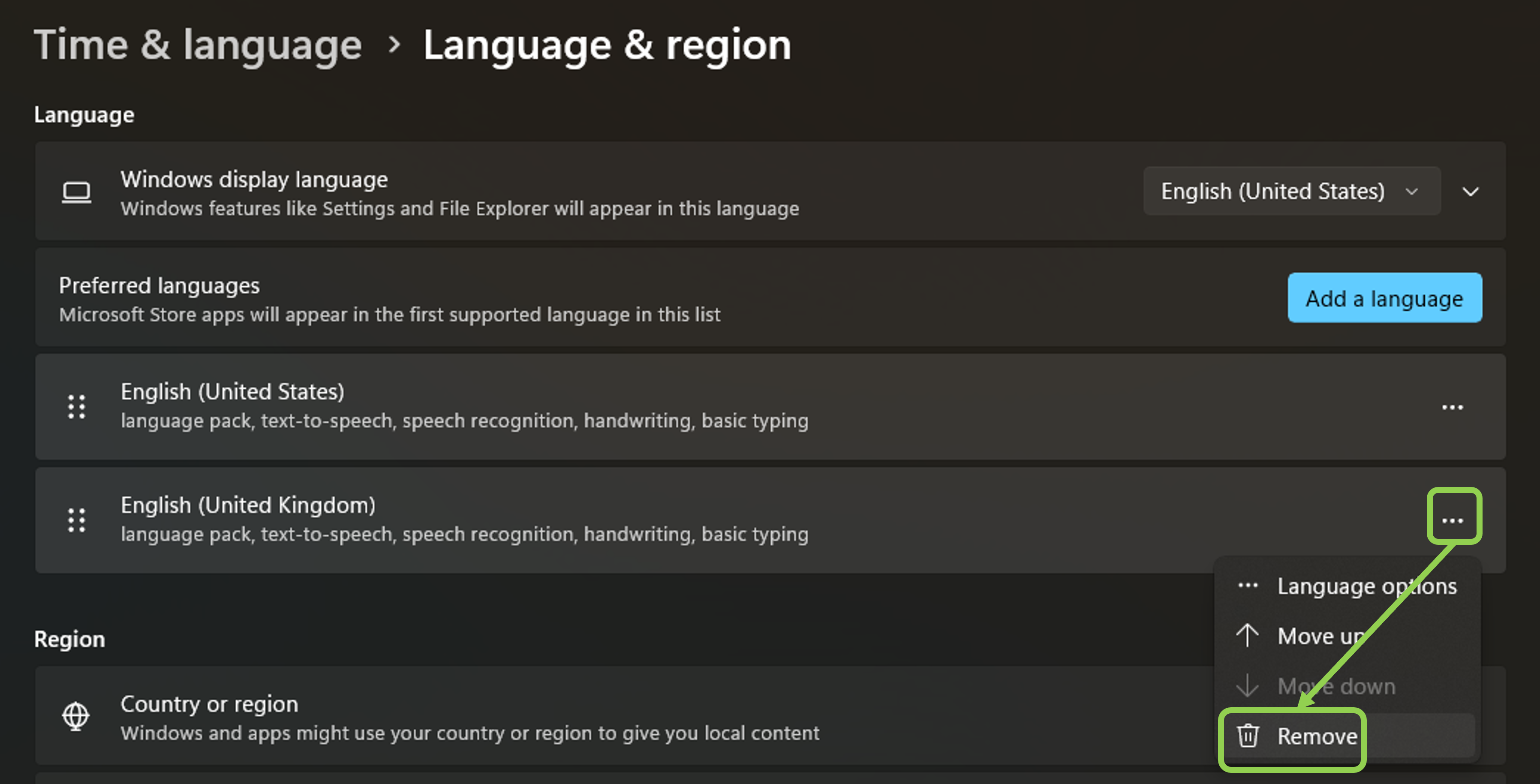 Click the triple dots on the language you want to remove, then click "Remove".
