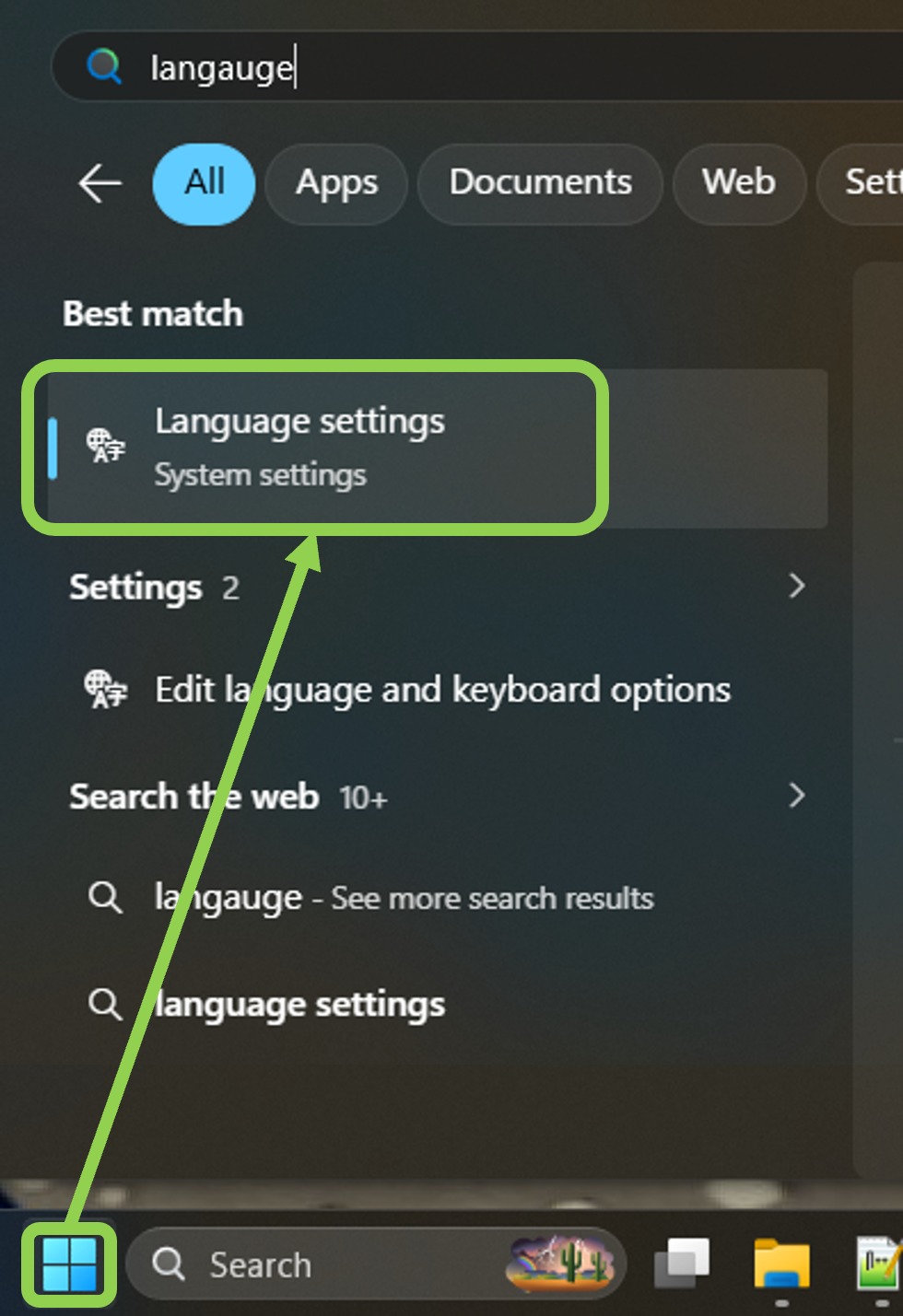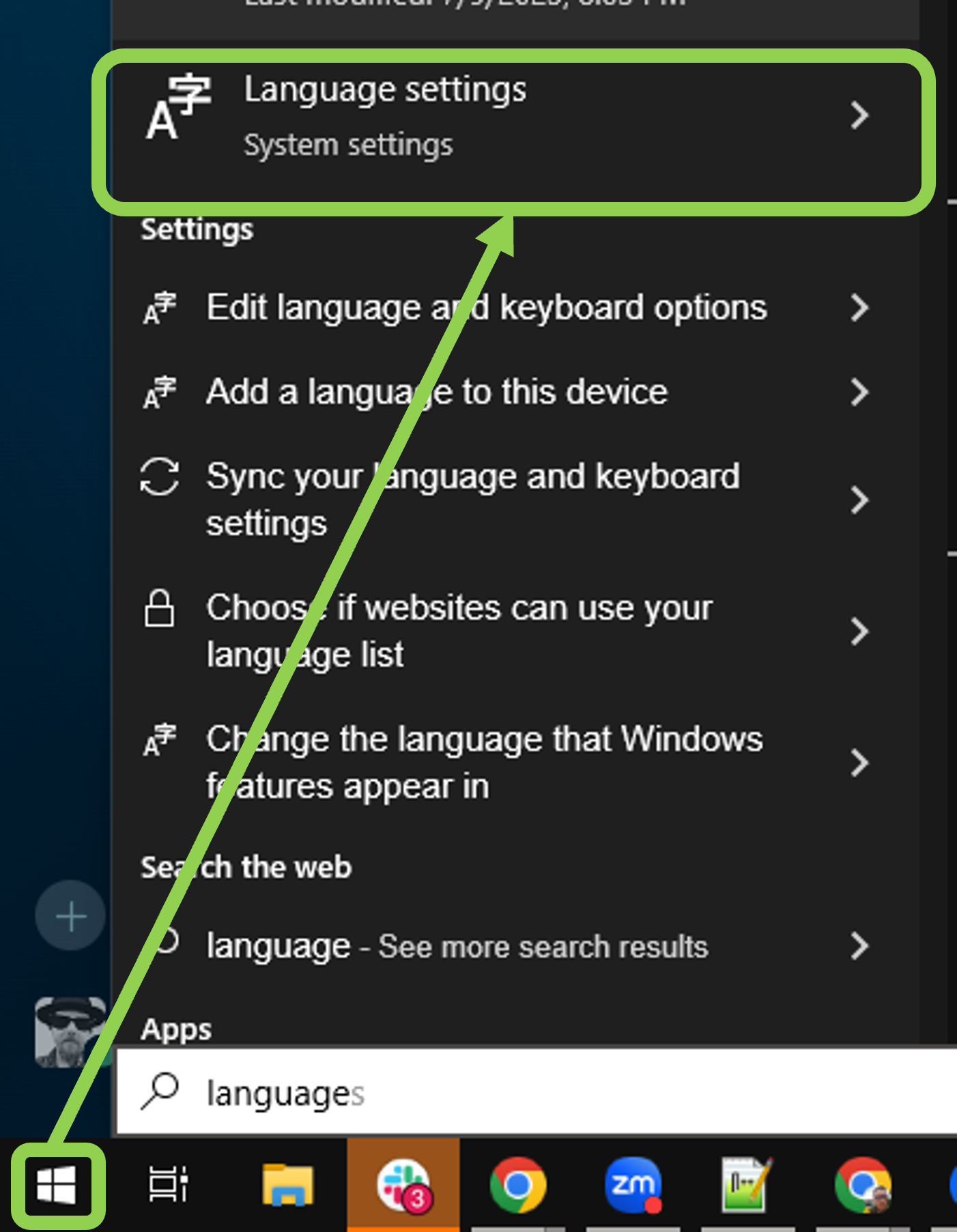 To remove the additional language, press the Windows/Start key, type "language", and open the "Language Settings".