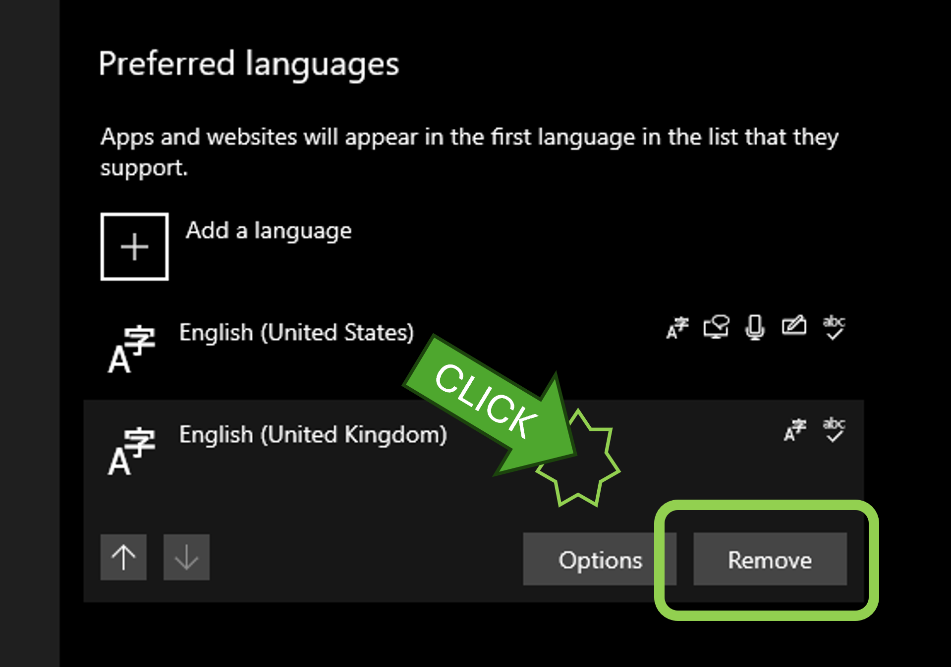 Click on the language you want to remove. Buttons will appear. Click the [Remove] button.