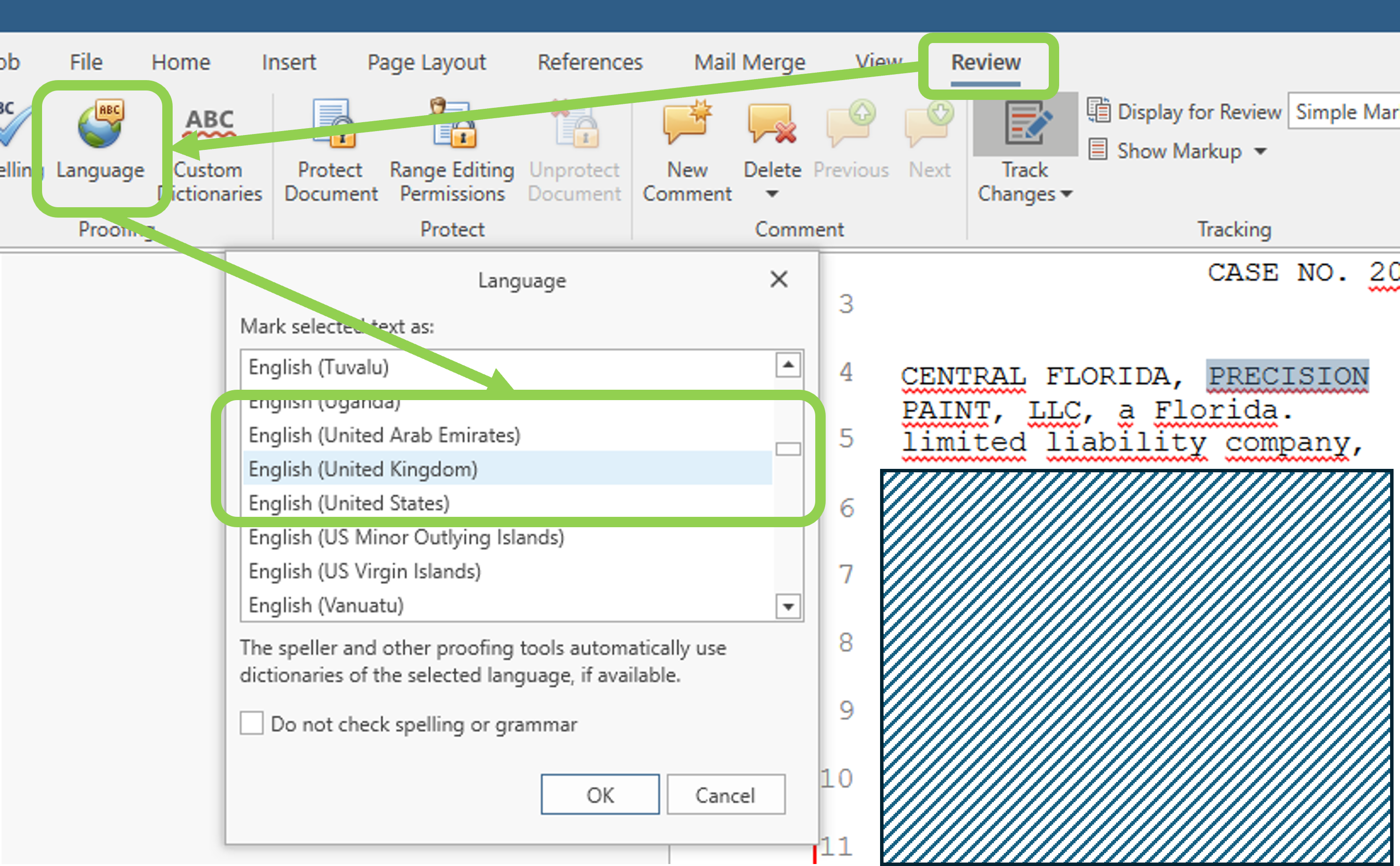 To fix the problem, select the entire document contents (the default is [Ctrl]+[A]), then click Language on the Review tab, scroll down, select "English (United States)", then click [OK].