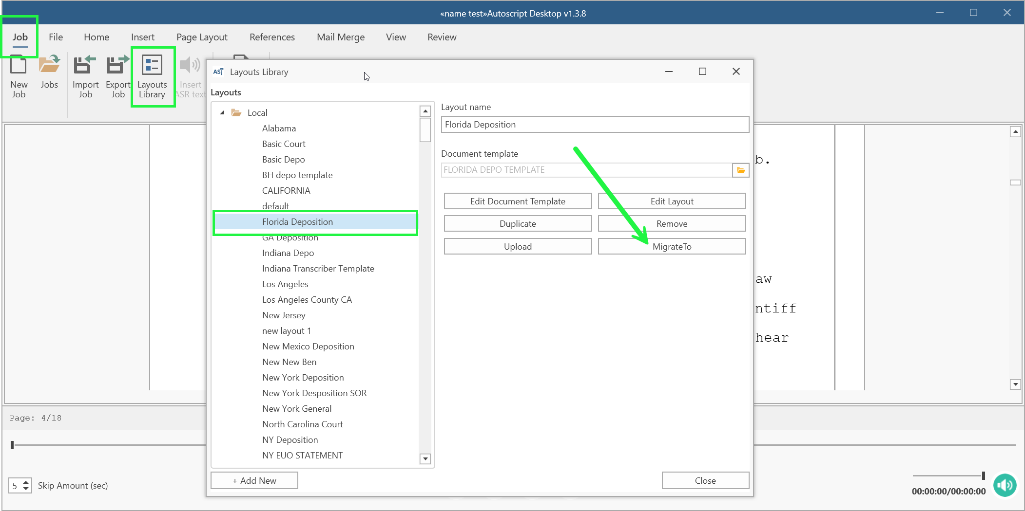 Go to the "Job" tab, click the "Layouts Library" icon, select the layout you want to move the transcript to, then click the "MigrateTo" button.