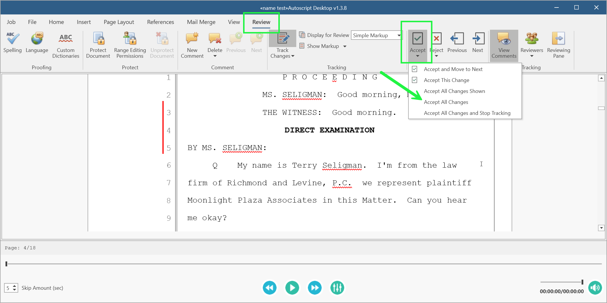 With the transcript open in AutoScript Desktop, go to the "Review" tab, click the down arrow on the "Accept" icon, and click on "Accept All Changes".