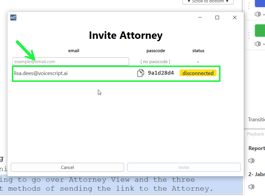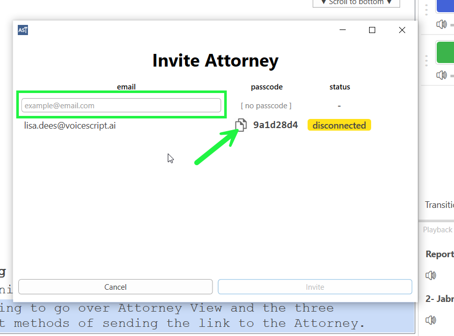 On your keyboard, press CTRL + Shift + ? to open the Attorney Streamer Invite modal. You will see a place to enter the Attorney’s email address. Enter their email address. You will now see their email in the list, along with a passcode and status.