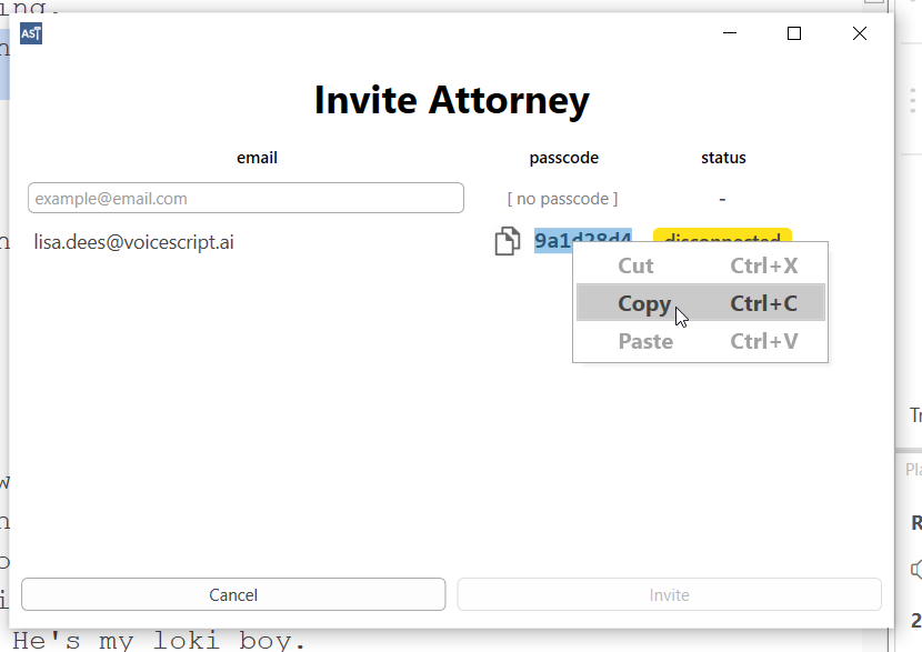 - On your keyboard, press CTRL + Shift + ? to open the Attorney Streamer invite modal You will see a place to enter the Attorney’s email address. Enter their email address. You will see their email in the list now, as well as a passcode and status.