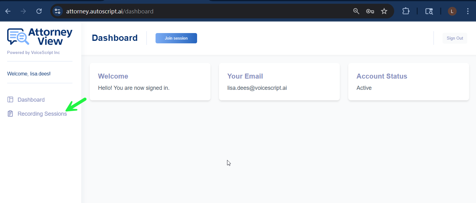 - Upon clicking the link, they will be taken to the Attorney Streamer Dashboard. They can navigate down to the Recording Sessions tab.