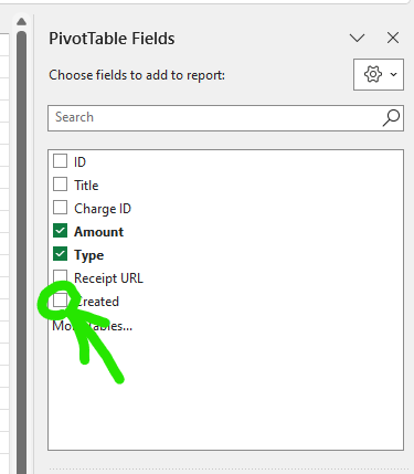 The pivot table is handy, but we need to add the "Created" field to make it really useful. On the right side of the window you should see the PivotTable Fields settings dialog. Click the check box next to "Created" in the field list at the top.