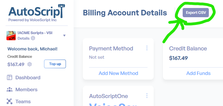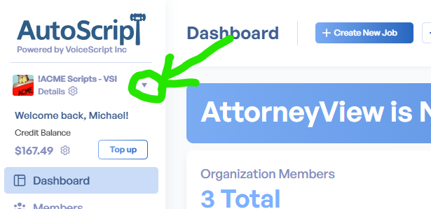 Before you can analyze the transaction list, you need to download it. Log in to the AutoScript website and select the organization who's transactions you want to view using the organization selector at the top left.