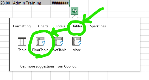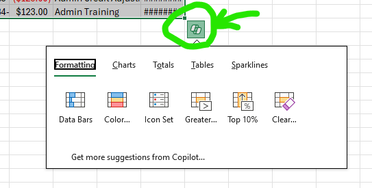 Once the cells are selected, you should see the Quick Analysis icon pop up at the bottom right of the selected area. Click on this icon to access your available options. You can also use the shortcut [Ctrl]+[Q] to open the Quick Analysis.