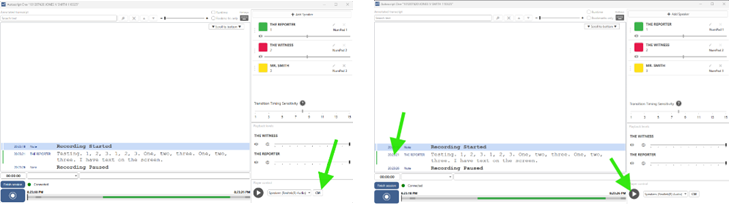 - Zoom sessions automatically begin recording when you connect. Say a few words to confirm that you have text appearing on the screen. Perhaps speak the date. Click "Record" in the bottom left corner of the reporter display to pause the session after your sound check. (This button will also allow you to pause the recording during breaks.) Resume the recording when you are ready to go on the record.